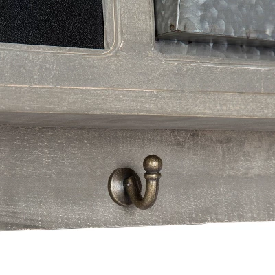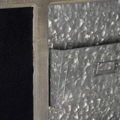 - Decorative wall mounted organizer with chalkboard, two galvanized metal file pockets and three lower metal hooks