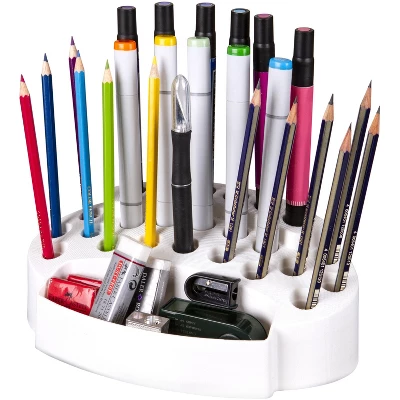 This organizer keeps your most used markers, pens, pencils and tools all at your fingertips. The perfect addition to your desktop! This 9.75x6x3.5 inch package contains one organizer with 24 slots and a bulk storage area. Imported.