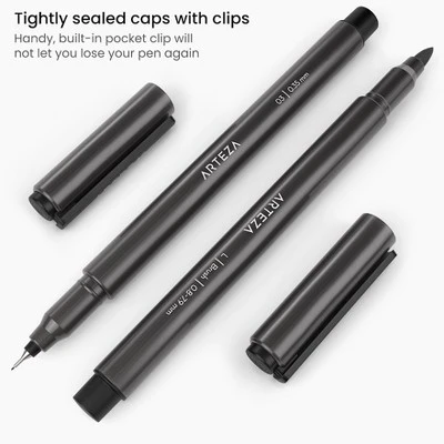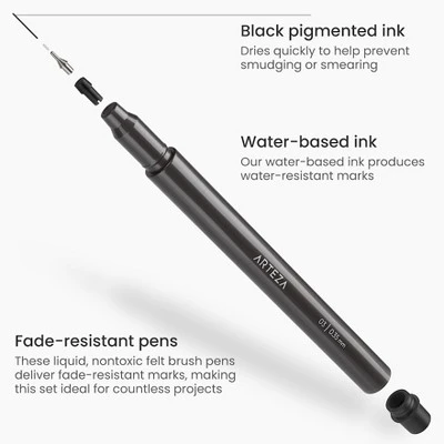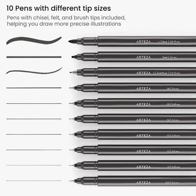 Arteza’s Micron Pens Set of 10 features a wide range of black pens in different sizes and nib styles. This plentiful pen set includes the following tip sizes: 005, 01, 02, 03, 04, 05, 08, and 2 mm. Our set of 10 black micro-line pens features chisel, felt, and brush tips, providing artists with true range in their pens. Our black Japanese Archival ink is completely non-toxic.