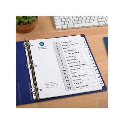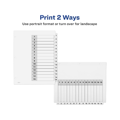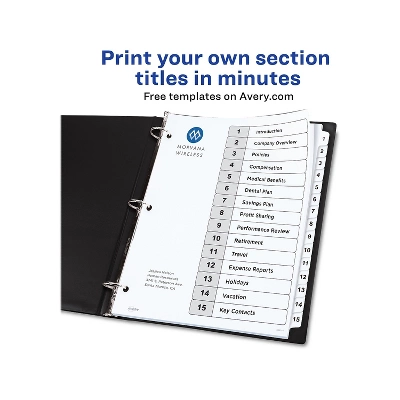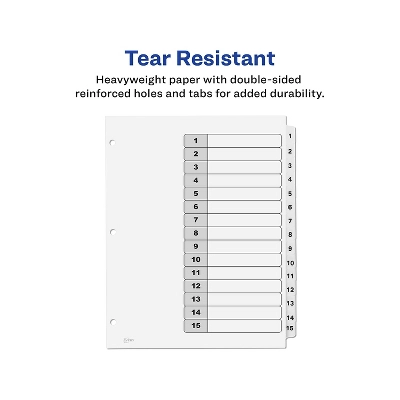 Organize your documents quickly and easily with these Avery paper dividers. Customize with a logo, name, date or project title to the left of section titles. Heavyweight paper with double-sided reinforced holes and extended tab reinforcements provide added durability. Avery paper dividers are great for project binders, meeting materials, reference or training manuals, archiving and more. Tab dividers let you organize projects, personal documents, and more. Made of white paper. Dimensions: 8.5″”W x 11″”L. 3-ring binder holes are reinforced on both sides of the heavyweight divider sheet to prevent tearing. 6 sets of tabs 1 – 15. Sold as 6/Pack.