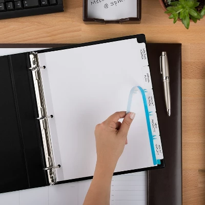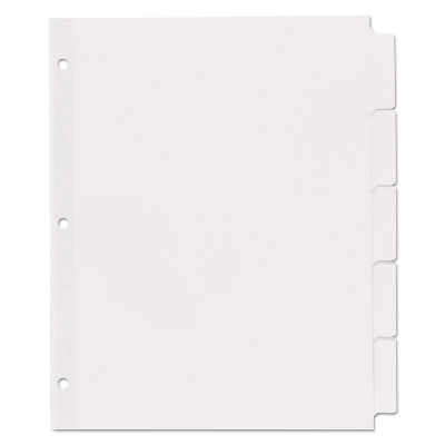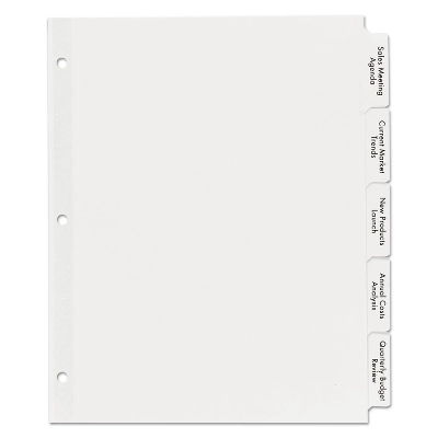 Subdivide your file folders with this five-pack of Avery Big Tab Index Maker five-tab clear-label white dividers. Don’t waste time and money ordering custom printed binder dividers with tabs when you can easily create and print your own personalized dividers with Avery Index Maker Clear Label Big Tab Dividers. Our larger Big Tab design offers more room for bigger fonts, more text and even logos or images. Customize your title tabs quickly and easily using the free templates on the Avery website and print with your inkjet or laser printer for clean, professional looking results in minutes. This pack comes with 5 sets of 5-tab dividers, and the Easy Apply clear label strips make it simple to apply all 5 labels of each set at once. Just print, align labels against tabs, smooth down labels and peel up strip. Each 3-hole punched durable divider also features doubled-sided, reinforced tabs and edges to help resist tearing for long-lasting, everyday use. These 3 ring binder dividers with tabs are a great addition to your medical office supplies, school binders, personal organizers, tax office supplies, presentation reports and more. Print, peel, and press your way to a perfect, precise project. Get 40% more writing space than other tabbed dividers with our Big Tab design, perfect for more text, bigger fonts, logos and more. Save time and money by creating your own high-quality custom tab dividers using free templates from the Avery website and printing on your laser or inkjet printer. Label all 5 tab dividers at once with the Index Maker Easy Apply Label strip that results in five perfectly aligned sets of tabs. Get a professional, printed-on look with clear labels that virtually disappear on the white divider tabs. Great for organizing your medical document binder, meeting materials, proposals, tax organizer binder, financial planner and more. Tab dividers let you organize projects, personal documents, and more. Clear label white tab dividers ..