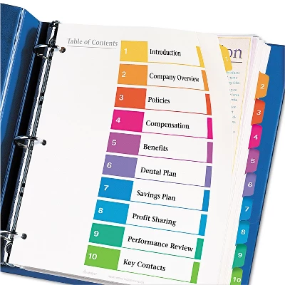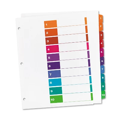 Organize documents quickly and efficiently with these Avery Ready Index extra-wide 1-10 table of contents dividers. Keep important information organized with these Avery Ready Index table of contents dividers. Each one has 10 sections so you can easily create a color-coded table of contents page, while the dividers help you find documents fast. These Avery Ready Index table of contents dividers come in multiple colors and can be custom-designed so everything looks exactly how you want it. Tab dividers let you organize projects, personal documents, and more. White paper dividers with multicolor tabs. Dimensions: 9.5″”W x 11″”L. 10-tab set of three-hole punched dividers. Sold as one 10-Tab Set.