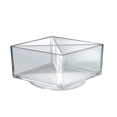 These Clear Acrylic Divider Trays on a rotating base offer clean lines and complete visibility to whatever you put inside. Place this large square tray on your counter or desk and organize anything you want: makeup, hair accessories, pins, jewelry, crafts, trinkets, paperclips, rubber bands or any loose item. The spining base gives you easy access to the items in each compartment. The 4 compartment holder has polished edges giving it a touch of fancy that will match with any décor. Get organized and clutter free with this 4 compartment acrylic tray. Sold in Multiples of: 1 Material: Crystal Styrene Overall Measurement: 8W x 8D x 4H Color: Clear Material Thickness: 3/16 Thick Number of Compartments: 4 Base: Revolving