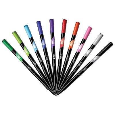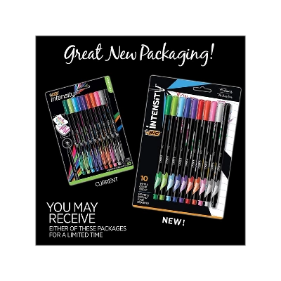 Fine like a pen. Bold like a marker. That’s BIC Intensity fineliner fine. These BIC felt pens feature bold colors that won’t bleed through paper (results could vary based on paper characteristics). The pens have a precise 0.4mm fine point that’s perfect for fine-detail work. The pens’ water-based ink is ACMI approved nontoxic. Sturdy metal nibs make these markers suitable for use with templates, rulers, and other straight edges. With a spectrum of bright, vivid hues, the BIC Intensity fineliner felt pens offer a superb combination of color and precision. These marker pens are perfect for colorful note-taking, creative writing, adult coloring, and journaling that stands out. Fine like a pen, bold like a marker: these marker pens are perfect for colorful note-taking, creative writing, adult coloring, and journaling that stands out. Pens come in a spectrum of 10 assorted bright, vivid hues, offering a superb combination of color and precision. Precise 0.4mm fine points are perfect for fine-detail work. Black barrels have color-coded accents for easy ink color identification. 10 marker pens per pack. Sturdy metal nibs make these marker pens suitable for use with templates, rulers, and other straight edges. Water-based ink is ACMI approved and nontoxic. Sold as 10/Pack.