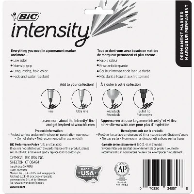 Durable permanent markers offer bold, vibrant, long-lasting color in shimmery metallic hues. BIC Intensity Metallic Permanent Markers create colorful, sparkling marks on just about any dark or light surface. Perfect for use on porous surfaces such as paper and cardboard, each ACMI-approved and non-toxic marker comes equipped with a fine point ideal for adding a splash of glistening color to adult coloring pages, doodles, and arts and crafts projects. The soft rubber grip promotes comfort and control during extended coloring and crafting sessions, while a unique snap cap prevents markers from drying out. This set includes eight bright, sparkly metallic markers with low-odor, acid-free inks. Unique Snap Cap prevents dry out with a vapor seal locking mechanism. Low-odor permanent marker provides long-lasting, bold color in shimmery metallic hues. Quick-drying, fade and water resistant. Acid-Free ink. Non-Slip grip for comfort and control. Fine point creates neat, legible marks — great for labeling, posters, crafts, and other projects. Marks on light and dark surfaces. Marks on just about everything including: glass, metal, plastic, photos, foils, coated paper, oily and damp surfaces. Made in the USA of US foreign parts. Best for use on porous surfaces such as paper and cardboard. Pack of 8 metallic permanent markers in vivid assorted colors. Certifications Standards: ACMI approved non-toxic. Sold as 8/Pack.