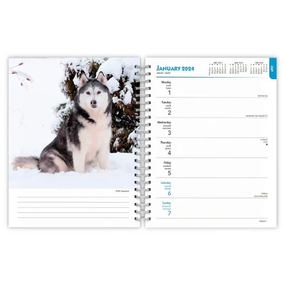 The Siberian Husky’s Arctic ancestry means that this dog loves to roam and explore. The Husky is an outgoing, fun-loving dog quick on its feet and graceful in its actions. This dog’s stunning blue eyes are hard to resist. This calendar features not only excellent photographs of adult Siberian Huskies, but delightful photos of precocious Husky pups as well.