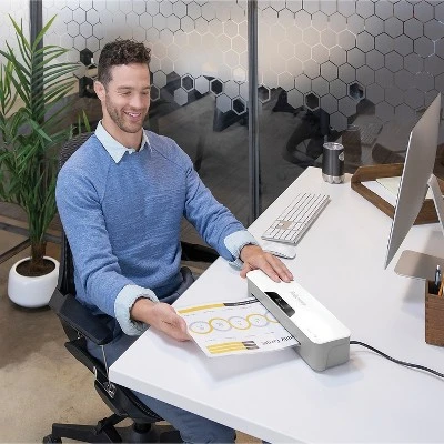 - White/light gray thermal and cold laminator for use with laminating pouches to protect documents. Auto Shut off saves energy and prevents overheating.
