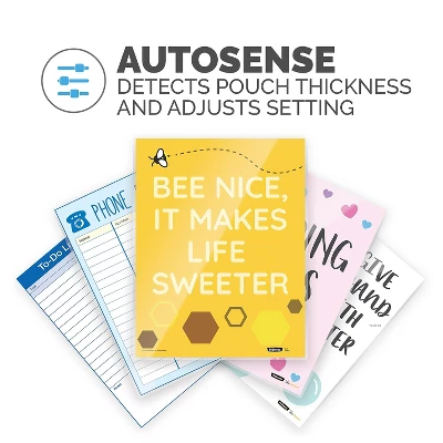 - 13″ throat width. Auto shutoff saves energy and prevents overheating when not in use. AutoSense system detects pouch thickness and self-adjusts to the optimal laminating setting.
