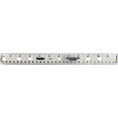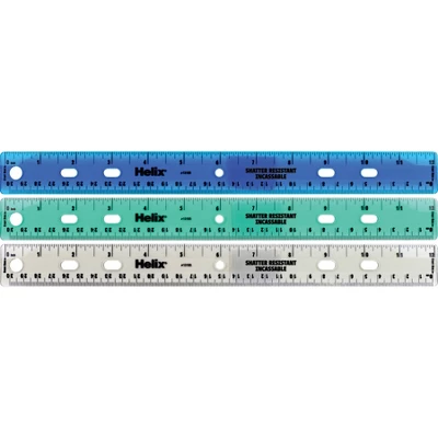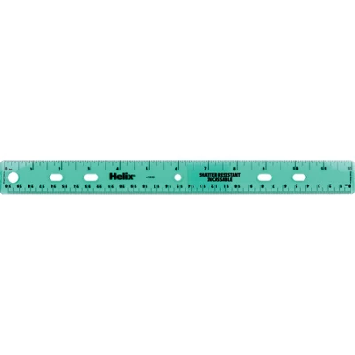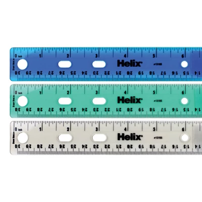 Helix Shatter Resistant Ring Binder Ruler 12″ / 30cm, Pack of 25 | Classic 12″ / 30cm Ring Binder ruler, now made safer with shatter-resistant material! Unlike standard rulers that create dangerous shards of plastic when bent or broken, our shatter-resistant material is much safer if the ruler is broken, making it ideal for young students. And the translucent body means you can easily see what you are measuring for better accuracy with both Metric and Inch graduations printed clearly on the ruler. Integrated ring binder holes and a large hang hole make this ruler easy to transport and store! Sold as a pack of 25 in assorted colors: Teal, Blue and Gray (no color choice).