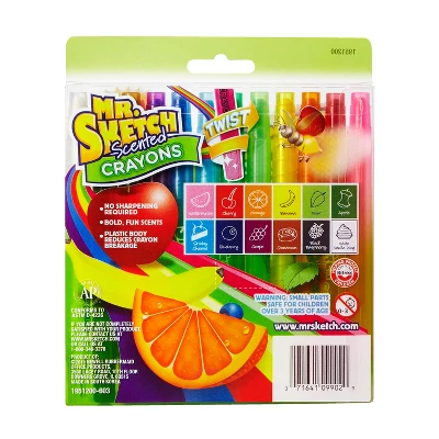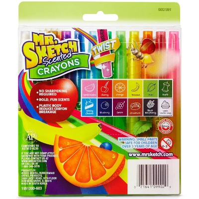 Mr. Sketch Scented Crayons give coloring a fun new twist! Bright colors in clear plastic barrels combined with Mr. Sketch scents create a wild sensory experience. The fun never stops thanks to a unique twist design that eliminates the need to stop and sharpen plus a hard plastic body helps reduce breakage. Sold as a set of 12.