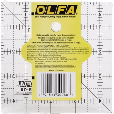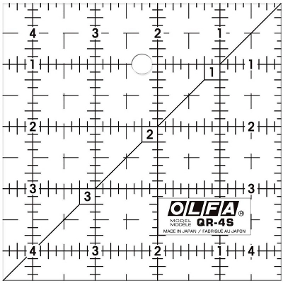 OLFA Frosted Advantage 4.5×4.5 Square Acrylic Ruler is non-slip for stable and safe cutting. Frosted back with black grid lines for clarity on light- and dark-material. The large bold black numbers are easy to read. The ruler has black grid lines at every inch, dotted black lines mark the half-inch and black tick marks along the solid line mark the quarters and eights. The frosted back grips in place for safe, stable cutting but repositioning for small adjustments. The perfect template for 4 inch squares used in 9 patch blocks, baby quilts, miniatures and charm quilts. Also useful for trimming half square triangles and small piecing. Great for paper crafting and trimming photos. For right- and left-handed use. Hole for convenient hanging. Available in 8 sizes. This package contains one 4.5×4.5 inch acrylic ruler. QR-4S, 1071797. Imported.