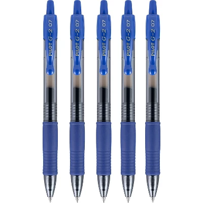 Write comfortably with this 5-pack of Pilot G2 premium fine-point retractable blue gel roller pens. Enjoy the comfortable design of these premium fine-point retractable blue gel roller pens. The fine-point tip lets you create sharp, precise lines, so writing is neat and crisp, while the translucent barrel lets you see when the pen’s running low on ink. These Pilot G2 premium retractable blue gel roller pens don’t bleed or smear and come in a pack of five, so there are plenty to lend out. Retractable gel pens for everyday writing tasks. Blue ink is easy to read. Fine 0.7mm tip ensures crisp lines with every use. Translucent barrel for easy monitoring of ink levels. Five pens per pack. Comfort grip for superior control. Features a pocket clip for convenient carrying. Refillable ink allows pens to be reused instead of replaced to save money. Comfortable, round barrel design. Sold as 5/Pack.
