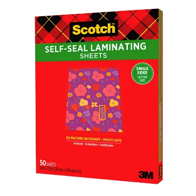 Scotch self-seal single sided laminating sheet protects your larger documents and is easy to use. Single sided sheet is ultra-clear to let important information show through and provides instant, permanent document laminating without heat or hassle. Letter size sheet is sold as 50 per pack. Laminating sheet size is 9 x 12 inches to laminate a 8-1/2 x 11 inch document.