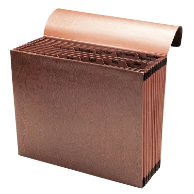 Protect important documents by placing them inside this 12-pocket Smead TUFF expanding file with elastic cord closure. Guard critical medical records, legal documents and hard-to-replace paperwork with this roomy accordion file system that is made from flexible plastic and expands to meet storage needs. This Smead expanding file has a secure flap, strong elastic and twelve labeled compartments ideal for monthly indexing. Featuring 12 pockets, these heavy-duty expanding files make organizing important documents easy. Top flap with elastic band ensures your papers stay in place. Made of redrope printed stock with brown extra TUFF construction. Includes monthly (Jan. to Dec.) labels for personalized organization. Reinforced side gussets ensure durability of this product. Holds letter-size documents. Contains 30% post-consumer material. Contains 30% recycled material. Sold as 1 Each.