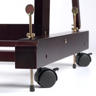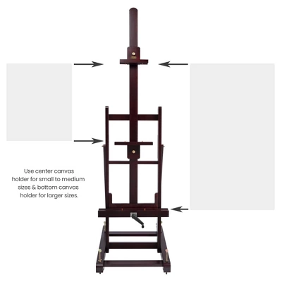 - FEATURES: Elegant mahogany finish, an easy-to-use crank system and 3 canvas holders, made out of furniture-grade lumber, removable wood pegs for edge-to-edge painting, turn knobs lock the canvas into place, four casters (two with locks), and easy to maneuver and fit into tight spaces