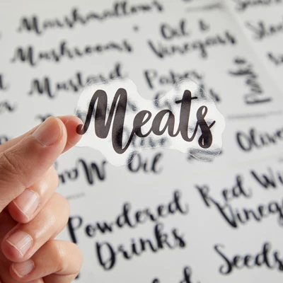 - Cursive Pantry Labels for Containers, No Messy Handwriting: Our pantry and fridge labels are printed in black large cursive font with high contrast for easy reading. These are solid decals, no rubbing required. Labels are preprinted on water-proof transparent vinyl that won’t peel off or tear, on premium material that can be removed and replaced if needed