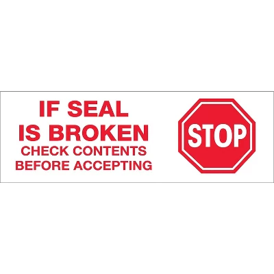 3″”(W) x 110 yds.(L) pre-printed carton sealing tape with legend “”Stop If Seal Is Broken”” Includes 1 per pack. Tape Logicโข Pre printed “”Stop If Seal Is Broken”” carton sealing tape in red/white color measures 3″” and has strong adhesive. Pressure sensitive tape communicates handling instructions and seals at the same time, sold as 24 per case. 24/Case. Thickness: 2.2 mil. Length: 110 yds. Thickness: 2 mil. Legend: “”Stop If Seal Is Broken””. Pressure sensitive. Eliminates the need for labels. Tape communicates handling instructions and seals at the same time. Freight class: 50. Width: 3″”. Length: 110 yds. 24 Rolls. Sold as 24 Per Case.