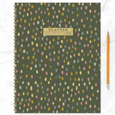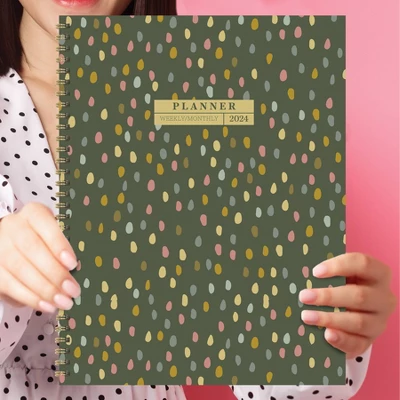 Don’t let rainy days get you down! Measuring 9″ (w) x 11″ (h), this all-encompassing 2024 large weekly monthly planner with a colorful rain drop cover design boasts monthly, 2-page spreads that include lined sections for notes, tasks, and goals and weekly, 2-page spreads with lined daily sections to keep plans neat and organized, plus a dedicated weekly priorities section to help keep you focused. The interior pages are designed with a classic and refined feel, accented with faux monthly tabs for easy access to weekly planning. Enhance your daily plans with 368 color coordinating stickers to highlight special occasions and personalize your planner. Bonus lined notes pages are in the back with yearly 2024 and 2025 views in the front. Featuring a durable, textured cover and sophisticated, gold wire-o binding designed to lay flat when open, this 12-month planner covers January 2024 – December 2024 and contains no plastic; Goods Without Guilt!