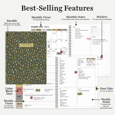 - Inside pages are designed with faux monthly tabs for easy access to weekly planning