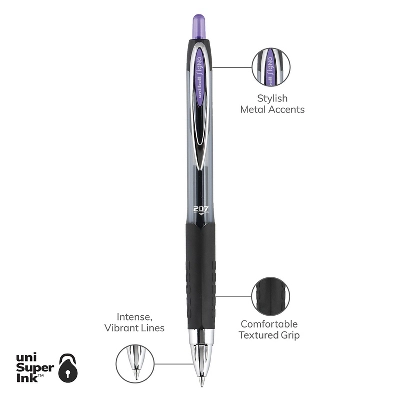 Bring artistic flair to your writing using these uni-ball 207 retractable purple gel pens. Stock your office, home or classroom with 207 Retractable Gel Pens from uniball featuring a 0.7mm medium point with a stainless steel tip that resists bending and breaking. Even-flowing, pigment-based gel ink delivers a smooth writing experience for intense, vibrant lines, ensuring that every mark is brilliantly communicated. Use these retractable gel pens for everyday writing tasks, check signing and all of your important signatures, trusting its quick-drying uni Super Ink. Innovative uni Super Ink technology effectively entraps the gel ink into the paper, producing fraud, fade and water-resistant documents that resist check washing or bleaching. The 0.7mm medium point strikes the perfect balance between bold and detailed lines. A textured grip offers greater comfort and control as you continue writing, while a translucent ink window indicates the level of gel ink remaining, so you don’t run out unexpectedly. The sleek design of the 207 with modern metal accents gives the retractable gel pen a stylish touch. The medium 0.7 mm point balances between detail and boldness, suitable for any writing or creative need. Water and fade-resistant gel ink helps you compose long-lasting, high-quality documents you can archive. uni Super Ink entraps the gel ink in the paper, creating a strong bond that resists document fraud. A textured rubber grip ensures ease of writing while helping you maintain good control; convenient clip ensures that your favorite gel pen is always at hand. Professional’s first choice gel pen with stylish metallic accents and a high-quality finish. Comfort grip for superior control. Features a pocket clip for convenient carrying. Refillable ink allows pens to be reused instead of replaced to save money. Gel pens feature smooth-flowing pigment-based ink with vibrant color. Sold as 1 Dozen.