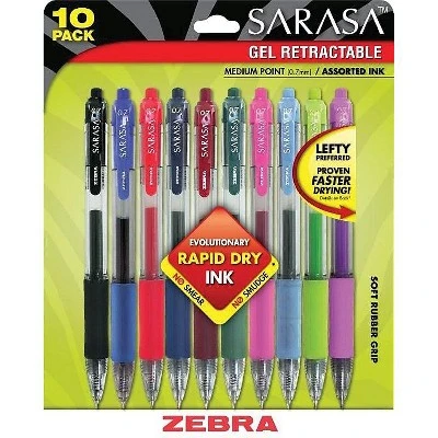 Create bright fine lines or letters with this Zebra SARASA 0.7mm retractable gel pen assorted 10-pack. Create fine lines and lettering in several bright, highly visible colors with this Zebra SARASA 0.7mm retractable gel pen assorted 10-pack. With Rapid Dry Ink technology, these pens produce lines that resist smearing while providing smooth-flowing ink for consistent results. This Zebra SARASA 0.7mm retractable gel pen assorted 10-pack has pens that retract for easy storage. Retractable gel pens for everyday writing tasks. Assorted colors ink. 0.7mm medium tip. Translucent barrel for easy monitoring of ink levels. Pack contains 10 pens. Comfort grip for superior control. Features a pocket clip for convenient carrying. Refillable ink allows pens to be reused instead of being replaced to save money. Sold as 10/ST.